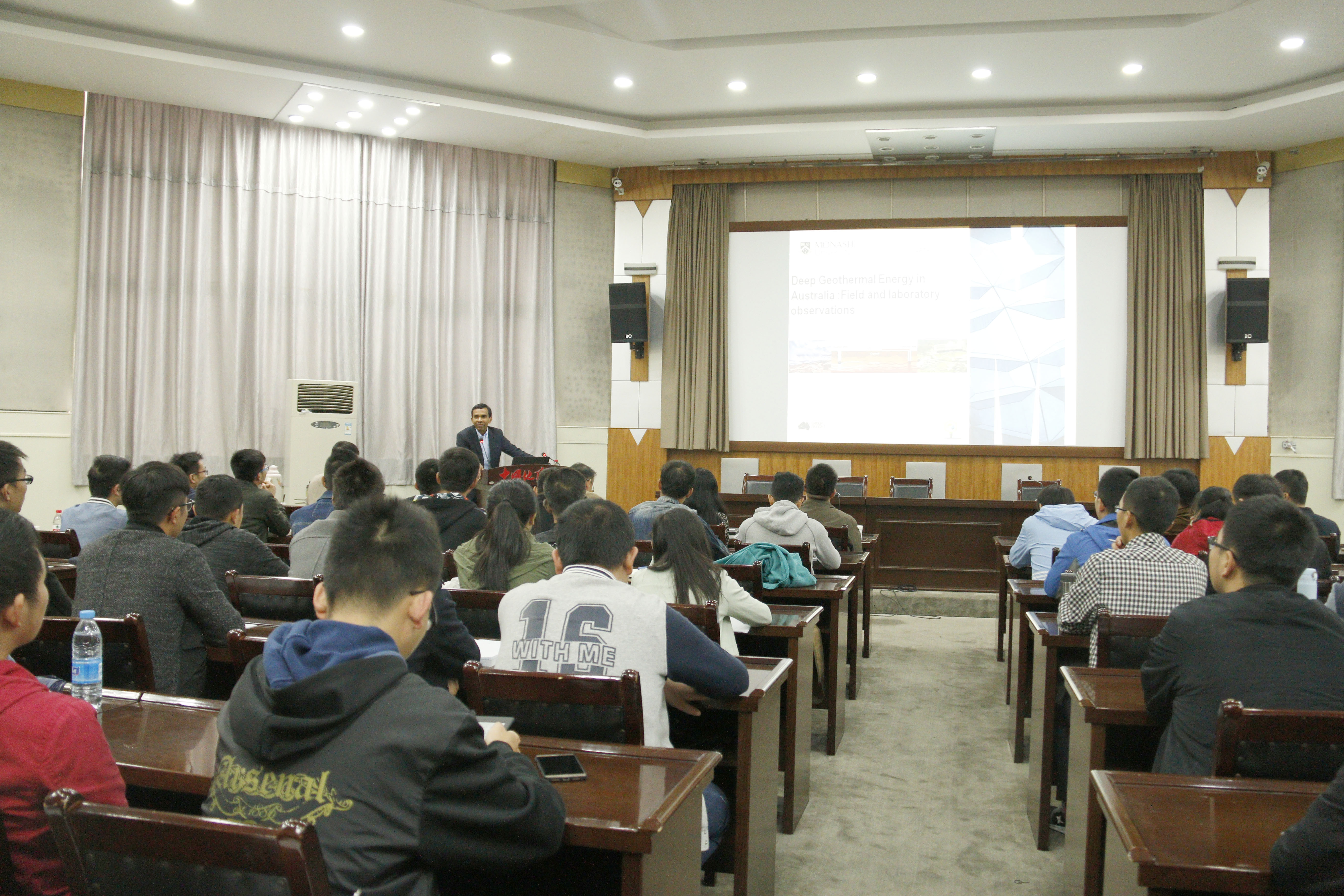 Ranjith教授从地热能发电的巨大潜力入手,介绍了一种增强型地热能源获取系统(EGSs),与传统的化石燃料相比,这种系统更加环保,是一种可再生的能源技术。Ranjith教授通过EGS系统的一些现场观测结果,对EGS系统进行了详细解析,并展示了其团队在EGS系统研究方面的最新研究进展。报告结束后,Ranjith教授热情地回答了师生的提问,他衷心希望能和公司在地热资源开发方面开展合作研究。