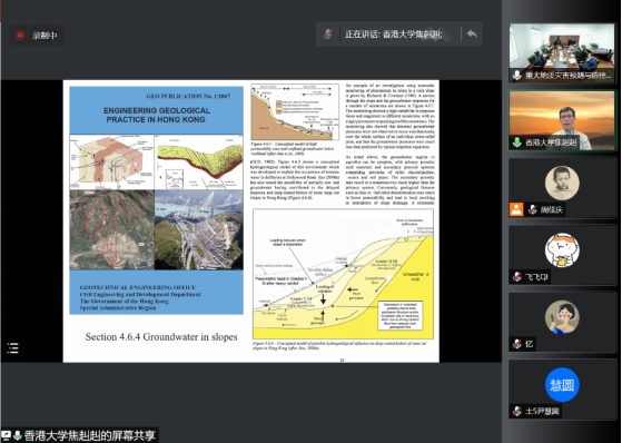 讲座结束后,李长冬教授对焦赳赳教授的精彩报告表示了感谢,随后参会师生针对承压水对边坡稳定性影响及治理方法、边坡稳定性评价行业规范编制、边坡稳定性分析中合理选取和考虑地下水位线、高密度建筑群对山地城市边坡稳定性影响等相关内容进行了深入讨论和交流。最后唐辉明教授对本次学术讲座活动进行了总结发言,感谢了焦赳赳教授的精彩学术报告,强调了地下水驱动和结构主控在滑坡灾害研究中的重要性,并希望今后公司能够持续稳定开展同香港大学的合作交流。