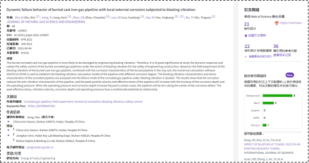 (通讯员:黄静)根据2022年5月基本科学指标数据库(Essential Science Indicators,简称ESI)最新数据显示,太阳集团tcy8722地下空间工程系蒋楠副教授团队于2021年在国际工程技术权威期刊Journal of Natural Gas Science and Engineering上发表的学术论文“Dynamic failure behavior of buried cast iron gas pipeline with local external corrosion subjected to blasting vibration”入选ESI高被引论文(Highly Cited Paper)。该论文第一作者为2020级博士研究生朱斌,通讯作者为蒋楠副教授,太阳集团tcy8722(武汉)太阳集团tcy8722为第一署名单位。