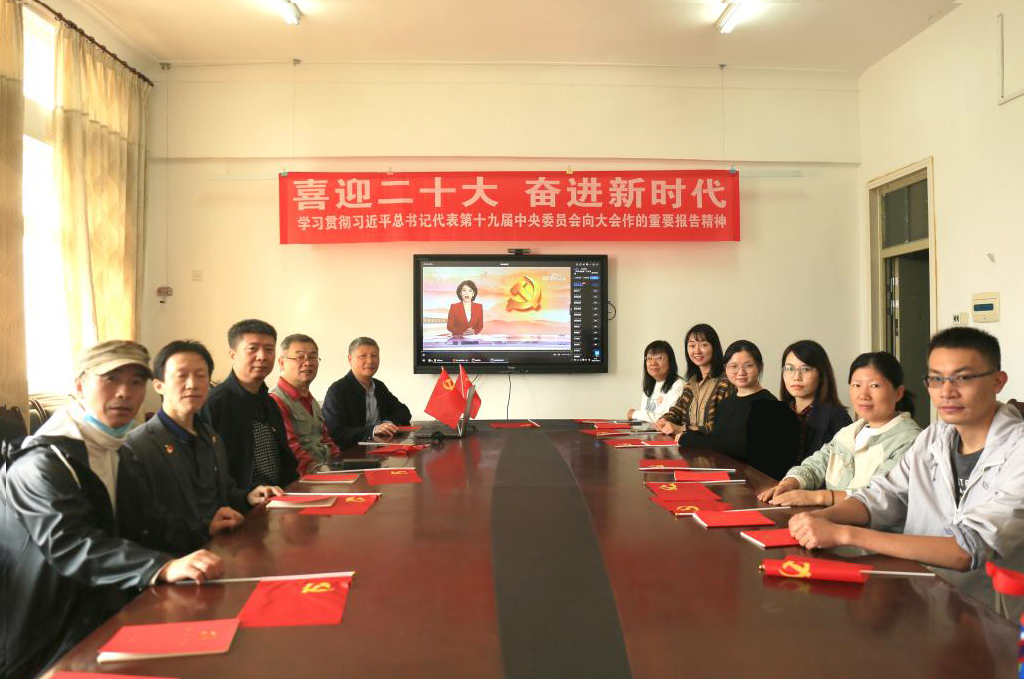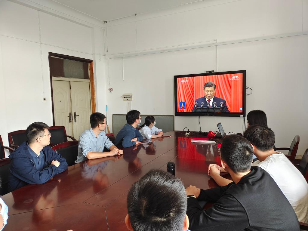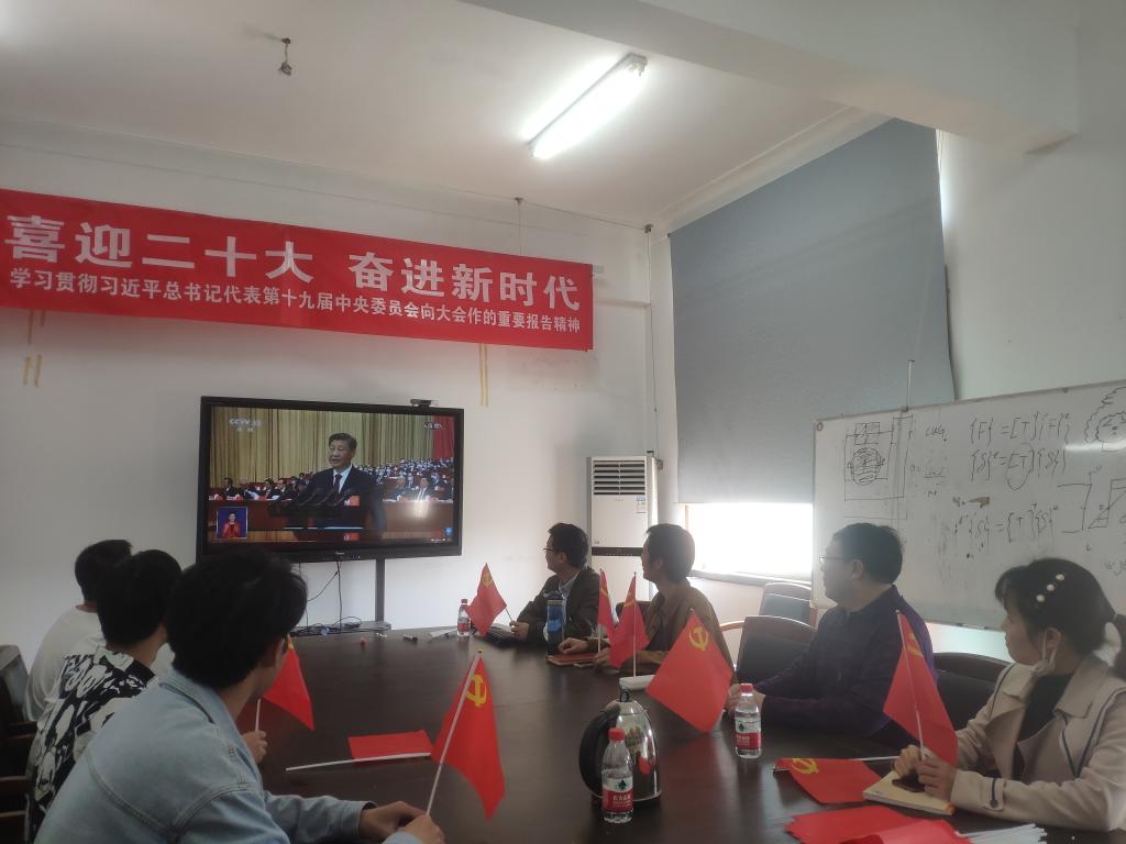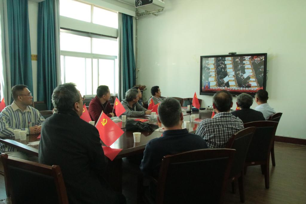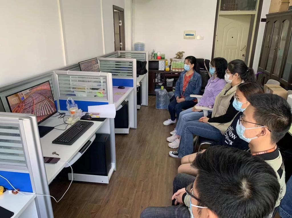 员工党员、团员代表在工程楼418集中收看