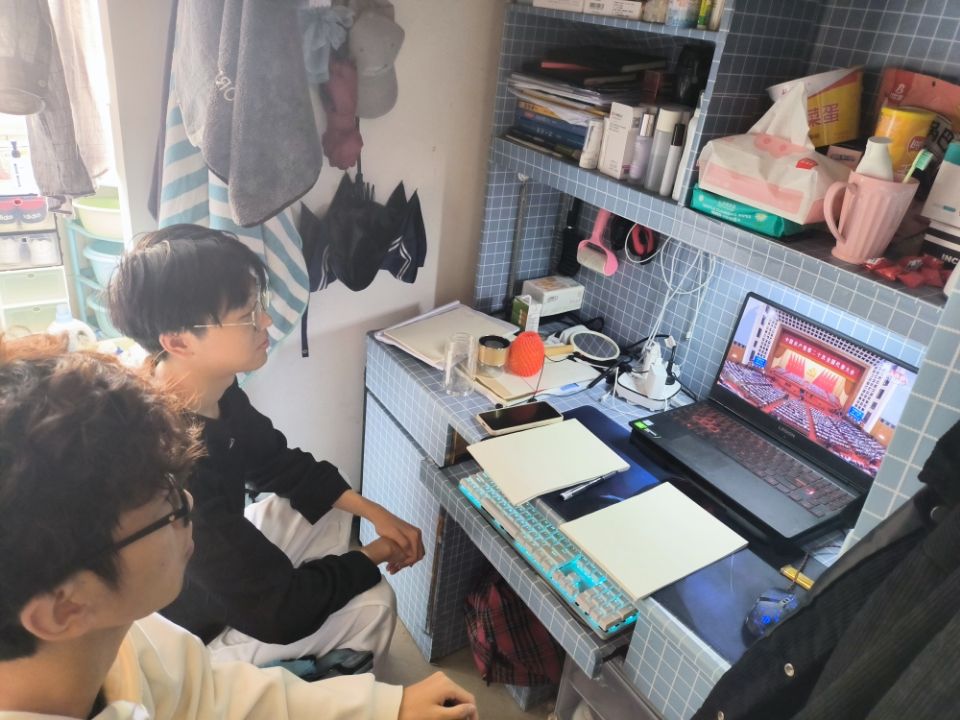 王亮清教授导学团队在工作室通过电脑进行集中收看