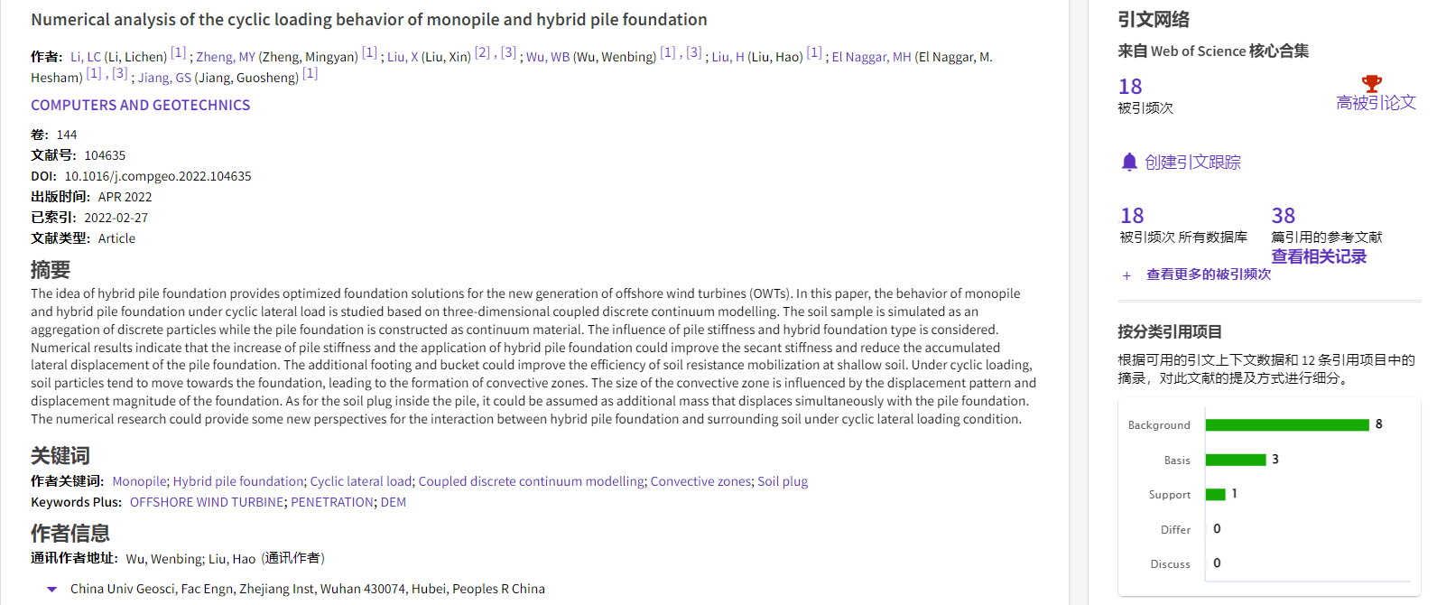 根据2022年11月基本科学指标数据库(Essential Science Indicators,简称ESI)最新数据显示,太阳集团tcy8722勘察与基础工程系吴文兵教授团队于2022年在国际岩土工程数值模拟权威期刊Computers and Geotechnics上发表的学术论文“Numerical analysis of the cyclic loading behavior of monopile and hybrid pile foundation”入选ESI高被引论文。该论文第一作者为勘察与基础工程系博士后李立辰,通讯作者为吴文兵教授,太阳集团tcy8722(武汉)太阳集团tcy8722为第一署名单位。