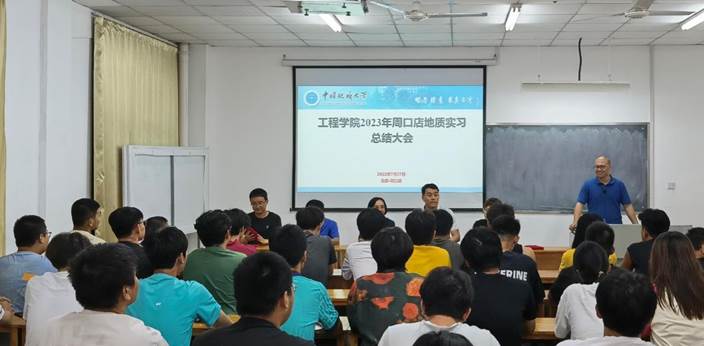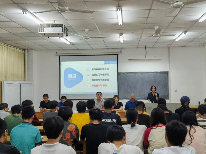 李红丽讲话,她指出,本年度周口店实习是在新冠疫情实行“乙类乙管”之后公司公司组织的第一次周口店野外地质实习,在为期28天的实习活动中,老师们备课充分、授课认真,对野外课堂的管理井然有序,并能及时处置突发状况,高标准完成授课任务,展现了新时代“四有好老师”风采;同学们吃苦耐劳、严肃活泼,积极践行“艰苦朴素,求真务实”的校训精神和“明理尚实,拓新砺行”的院训精神,体现出工程学子肯吃苦、敢拼搏、勇成功的豪迈气概。她强调,广大工程学子要继续发扬“自找苦吃”的精神,一是要坚定“敢吃苦”的信念,坚持“四个面向”,抱定为强国建设、民族复兴而奋斗的崇高理想,坚持吃苦在前、享乐在后,勇挑时代重担,勇攀科学高峰;二是要锻造“能吃苦”的意志,要以本年度周口店实习实践为契机,锻造坚韧不拔的毅力,将“咬定青山不放松”的韧性镌刻在心里、体现到行动中;三是要练就“战胜苦”的本领,要将理论与实践相结合,将校内学习与校外实习实训相结合,敏学善思、不耻下问,在理论与实践的反复验证中提升专业本领,掌握解决复杂地质问题和工程技术难题的能力。她祝贺师生完圆满完成了实习任务,锻炼了身体素质、提高了专业能力、收获了师生情谊,祝福师生们返程顺利、暑假愉快。