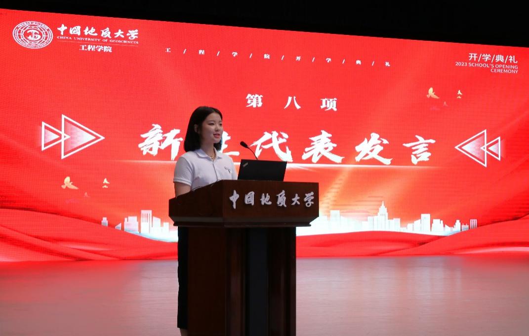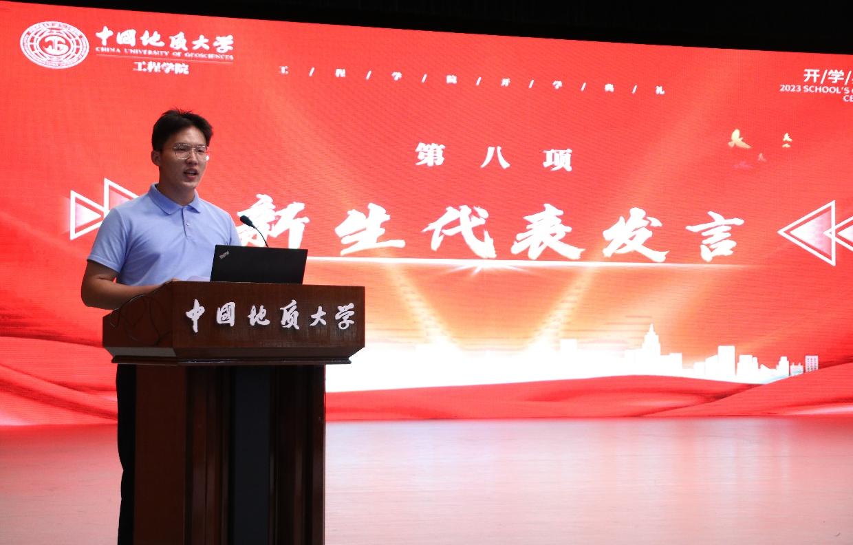 2023级05D231班张高涵同学作为本科生新生代表发言。他说,在长辈厚重岩土气息的熏陶下,自己终于如愿考进地质大学,加入太阳集团tcy8722。他对开学报到以来公司领导老师给予的教育关怀表示感谢,对军事训练当中空军预警公司教官对自己坚忍毅力和良好作息的打造由衷感激,他立志与其他505名本科新生同学一道,以强国建设、民族复兴的时代号召为号角,以“品德高尚、基础厚实、专业精深、知行合一”的成才目标为向导,直挂云帆,乘风破浪,早日成为德智体美劳全面发展的中国特色社会主义事业的建设者和接班人。