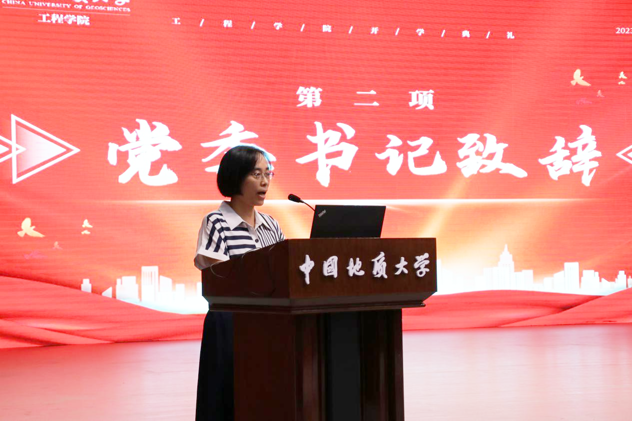 工程地质与岩土工程系教师吴琼作为教师代表发言。她以一名入学20年的“学姐”身份向各位新生分享自己的求学经历、教学经历、科研经历,从本科生到博士生,从硕士生导师到博士生导师,从职场小白到再取得一项项骄人的教学科研成果,风雨彩虹、铿锵玫瑰,她用自己的亲身经历书写着一名女性地质工程者向上攀登、步履不停的奋进史,为全体新生树立“真榜样”,帮助全体女生吃下学好工程专业的“定心丸”。吴琼老师寄语新生,要以理想者、担当者、吃苦者、奋斗者的姿态立足新时代、奋进新征程,创造新业绩、诠释正青春。