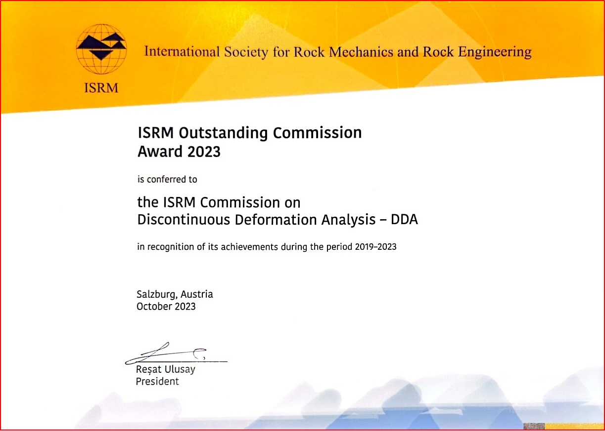 (通讯员 黄静)10月13日,在奥地利萨尔斯堡举行的第15届国际岩石力学与岩石工程大会闭幕式上,非连续变形分析专委会被国际岩石力学与岩石工程学会授予四年一度的杰出专委会奖,成为2019-2023任期唯一获奖的专业委员会。国际岩石力学与岩石工程学会主席Resat Ulusay教授为非连续变形分析专委会主席焦玉勇教授颁发了获奖证书。