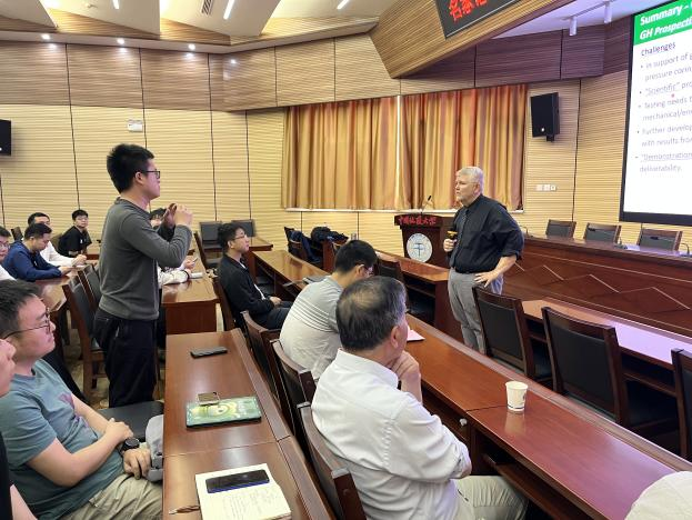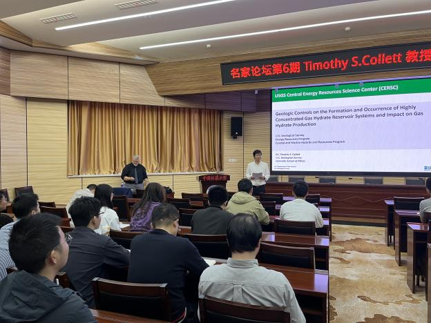 Timothy Collett教授对公司的诚挚邀请表示衷心感谢,并作了题为“Geologic controls on the formation and occurrence of highly concentrated gas hydrate reservoir systems and impact on gas hydrate production”的精彩报告。报告详细介绍了天然气水合物基础知识,对天然气水合物油气系统勘探情况进行了详细分析,以实例的形式系统总结了美国墨西哥湾、中国南海、日本南海海槽、韩国郁陵盆地和印度KG盆地的水合物勘探和开采情况,并对美国阿拉斯加冻土区前期和当前正在开展的水合物调查及试采情况进行了分享。最后,结合其丰富的现场调查研究经验,对未来水合物产业化开发面临的关键技术难题和研究方向进行了展望,并积极鼓励与会人员就报告内容开展交流和讨论。