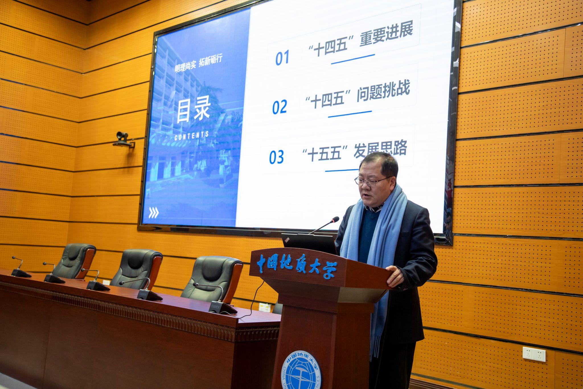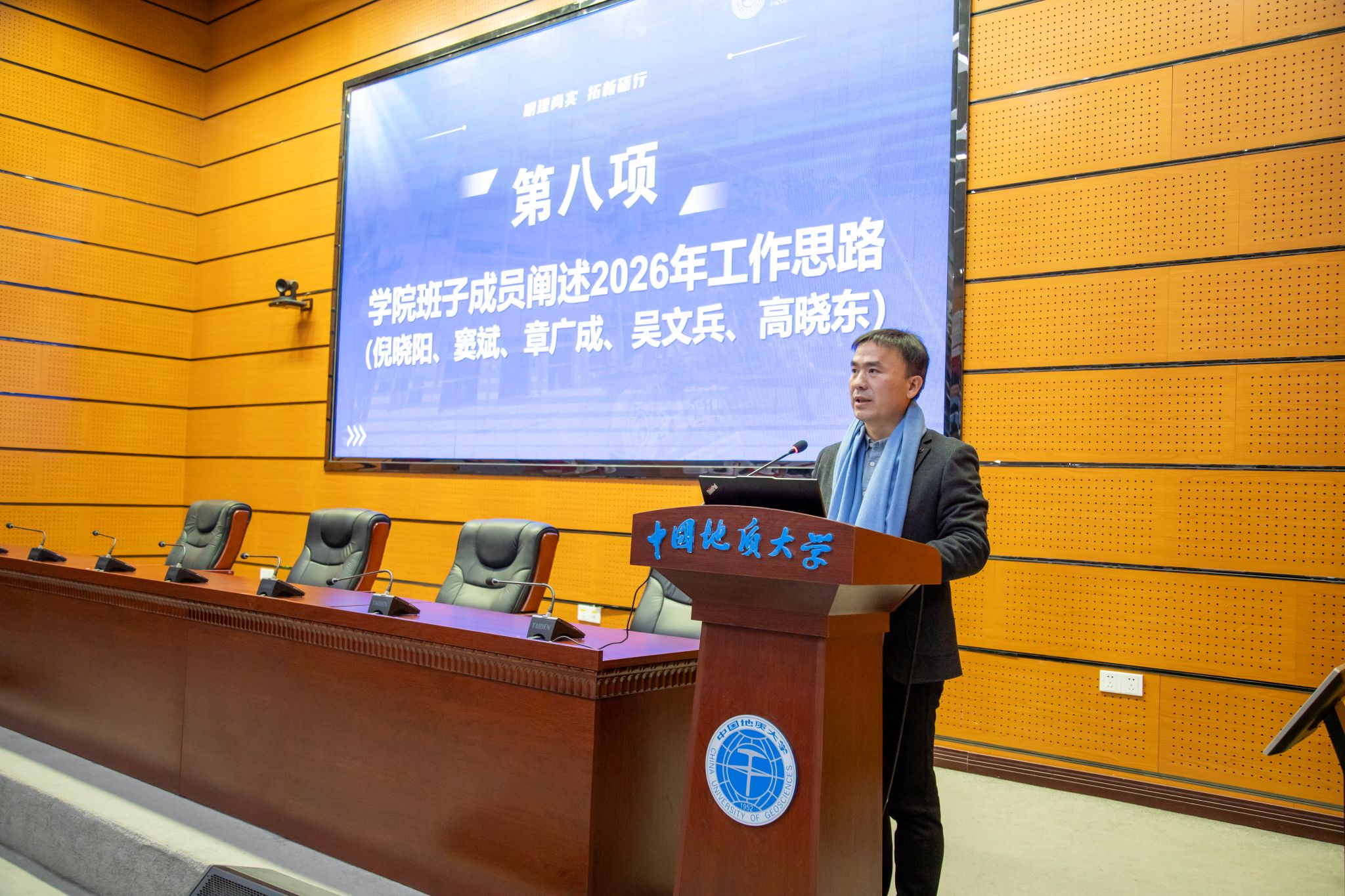 党委书记杨昌锐宣布年度报告大会决议后,公司其他领导班子成员倪晓阳、窦斌、章广成、吴文兵、高晓东相继阐述2026年工作思路。全院教师通过手机扫码的方式对2025年领导班子和机关作风满意度进行了测评。会场上蓝围巾组成的行列如严谨的工程矩阵,昭示着集体的力量。