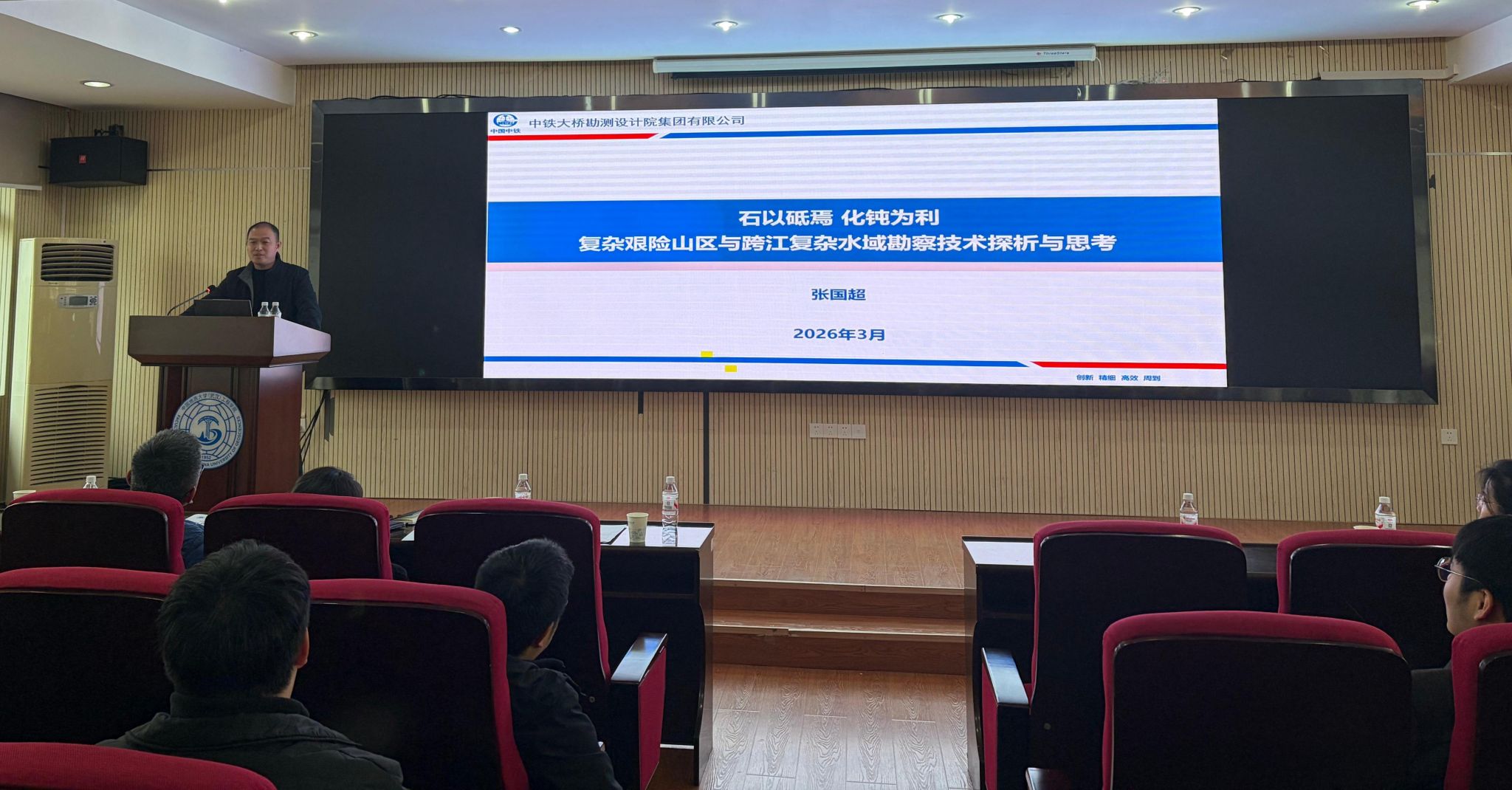 张国超正高级工程师的学术报告题目为“石以砥焉,化钝为利:复杂艰险山区与跨江复杂水域勘察技术探析与思考”。他以高原铁路金沙江特大桥、赤壁长江公路大桥、海太长江隧道等重大工程项目勘察实践为基础,结合自身一线工作成长经历,深入剖析了复杂艰险山区与跨江复杂水域场景下工程勘察的重点、难点及相应解决方案。立足于当前人工智能快速发展的时代背景,他阐述了野外踏勘工作不可替代的重要性,凸显了地质工作者深耕一线的宝贵品质。同时,结合现实工作中所遇到的各种困难,他强调了坚定信念的重要作用,并分享了依托优质平台与高效团队推动个人成长与工程实践的宝贵经验。最后,他结合实际项目经验,阐明了工程实践与科学研究之间是相辅相成、相互成就的关系,鼓励同学们要研究落地,服务社会。